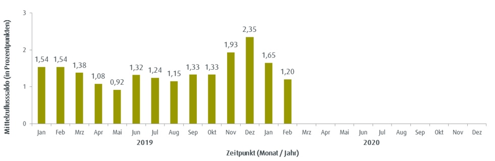 Veränderungen der Mittelzuflüsse und Mittelabflüsse werden über den Fundflow-Faktor ausgedrückt. Dabei werden die monatlichen Mittelzuflüsse des Berichtszeitraums in Relation zu den monatlichen Mittelabflüssen gesetzt. Bei einem Fundflow-Faktor über eins überwiegen die Mittelzuflüsse, bei einem Fundflow-Faktor unter eins die Mittelabflüsse.