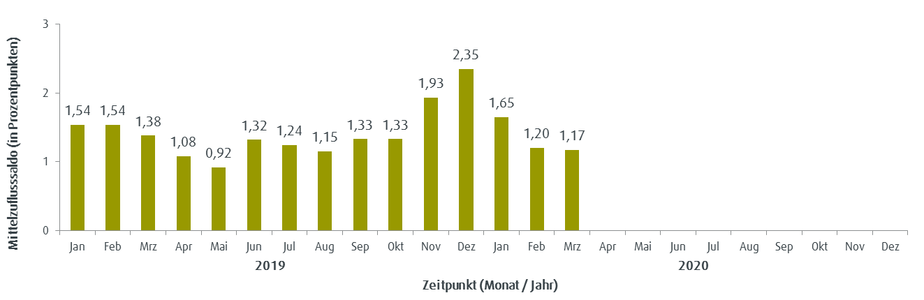 Veränderungen der Mittelzuflüsse und Mittelabflüsse werden über den Fundflow-Faktor ausgedrückt. Dabei werden die monatlichen Mittelzuflüsse des Berichtszeitraums in Relation zu den monatlichen Mittelabflüssen gesetzt. Bei einem Fundflow-Faktor über eins überwiegen die Mittelzuflüsse, bei einem Fundflow-Faktor unter eins die Mittelabflüsse.