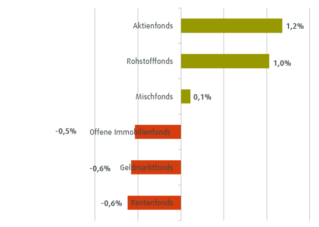 Im Oktober waren die Renditen von Fonds je nach Assetklasse sehr unterschiedlich. Während Aktienfonds (+1,2 %), Rohstofffonds (+1,0 %) und Mischfonds (+0,1 %) eine positive Entwicklung aufwiesen, waren die Renditen bei offenen Immobilienfonds, Geldmarktfonds und Rentenfonds im Durchschnitt negativ.