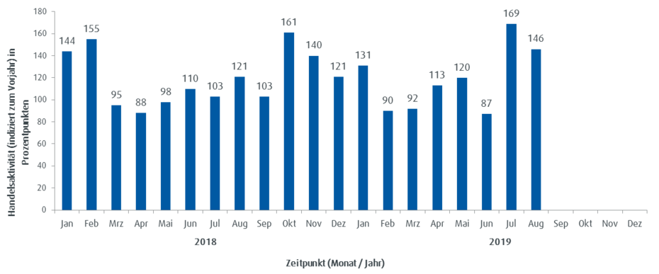 Die Handelsaktivität basiert auf dem Handelsvolumen und lässt unmittelbare Rückschlüsse auf den aktuellen Jahrestrend im Handel mit ETFs bei ebase Kunden zu. Ein Wert von über 100 steht für eine überdurchschnittliche Handelsaktivität der Kunden im Vergleich zum mittleren monatlichen Handelsvolumen des Vorjahres; ein Stand unter 100 zeigt eine unterdurchschnittliche Handelsaktivität an.