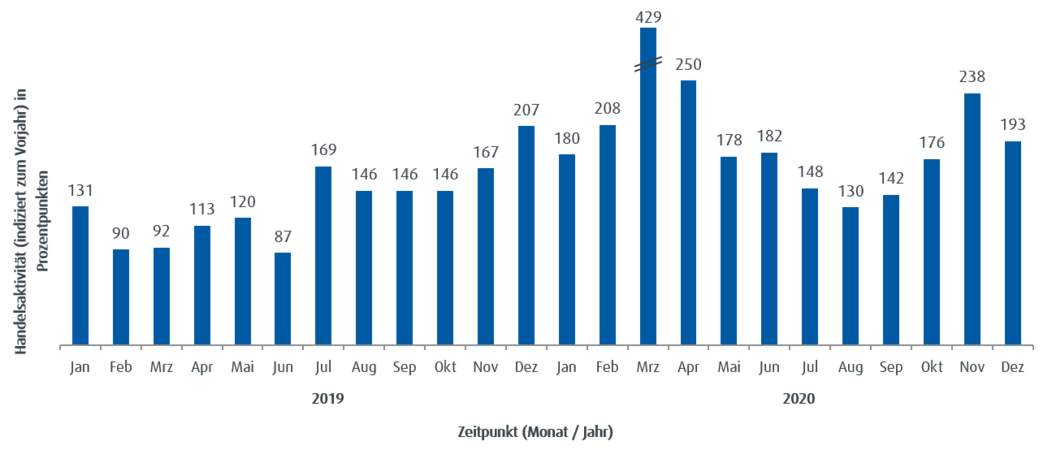Die Handelsaktivität basiert auf dem Handelsvolumen und lässt unmittelbare Rückschlüsse auf den aktuellen Jahrestrend im Handel mit ETFs bei ebase Kunden zu. Ein Wert von über 100 steht für eine überdurchschnittliche Handelsaktivität der Kunden im Vergleich zum mittleren monatlichen Handelsvolumen des Vorjahres; ein Stand unter 100 zeigt eine unterdurchschnittliche Handelsaktivität an.