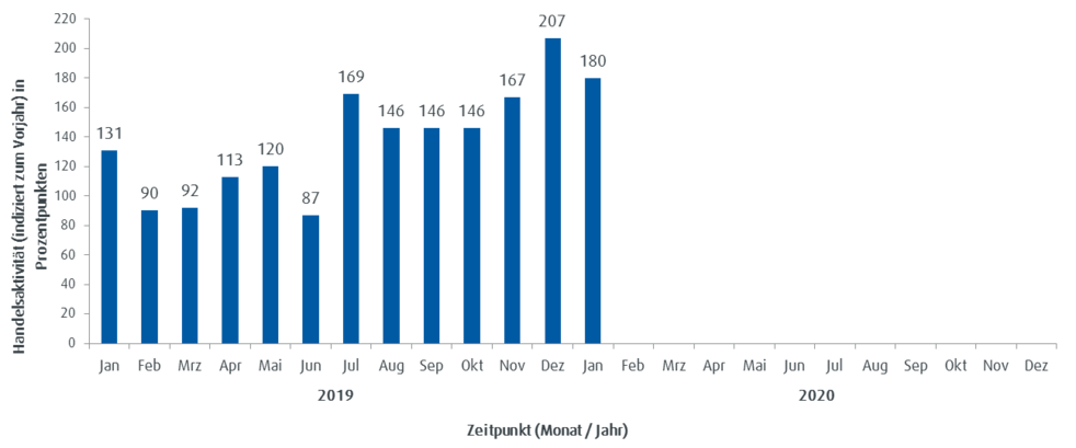 Die Handelsaktivität basiert auf dem Handelsvolumen und lässt unmittelbare Rückschlüsse auf den aktuellen Jahrestrend im Handel mit ETFs bei ebase Kunden zu. Ein Wert von über 100 steht für eine überdurchschnittliche Handelsaktivität der Kunden im Vergleich zum mittleren monatlichen Handelsvolumen des Vorjahres; ein Stand unter 100 zeigt eine unterdurchschnittliche Handelsaktivität an.