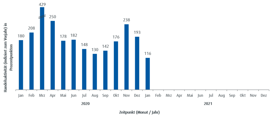 Die Handelsaktivität basiert auf dem Handelsvolumen und lässt unmittelbare Rückschlüsse auf den aktuellen Jahrestrend im Handel mit ETFs bei ebase Kunden zu. Ein Wert von über 100 steht für eine überdurchschnittliche Handelsaktivität der Kunden im Vergleich zum mittleren monatlichen Handelsvolumen des Vorjahres; ein Stand unter 100 zeigt eine unterdurchschnittliche Handelsaktivität an.