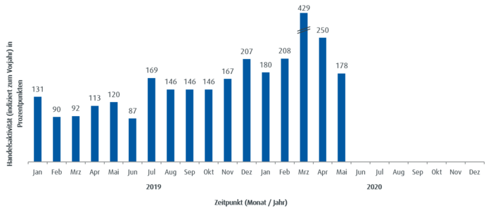 Die Handelsaktivität basiert auf dem Handelsvolumen und lässt unmittelbare Rückschlüsse auf den aktuellen Jahrestrend im Handel mit ETFs bei ebase Kunden zu. Ein Wert von über 100 steht für eine überdurchschnittliche Handelsaktivität der Kunden im Vergleich zum mittleren monatlichen Handelsvolumen des Vorjahres; ein Stand unter 100 zeigt eine unterdurchschnittliche Handelsaktivität an.