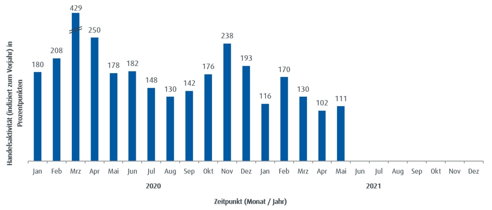 Die Handelsaktivität basiert auf dem Handelsvolumen und lässt unmittelbare Rückschlüsse auf den aktuellen Jahrestrend im Handel mit ETFs bei ebase Kunden zu. Ein Wert von über 100 steht für eine überdurchschnittliche Handelsaktivität der Kunden im Vergleich zum mittleren monatlichen Handelsvolumen des Vorjahres; ein Stand unter 100 zeigt eine unterdurchschnittliche Handelsaktivität an.