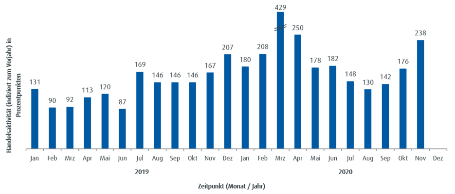 Die Handelsaktivität basiert auf dem Handelsvolumen und lässt unmittelbare Rückschlüsse auf den aktuellen Jahrestrend im Handel mit ETFs bei ebase Kunden zu. Ein Wert von über 100 steht für eine überdurchschnittliche Handelsaktivität der Kunden im Vergleich zum mittleren monatlichen Handelsvolumen des Vorjahres; ein Stand unter 100 zeigt eine unterdurchschnittliche Handelsaktivität an.
