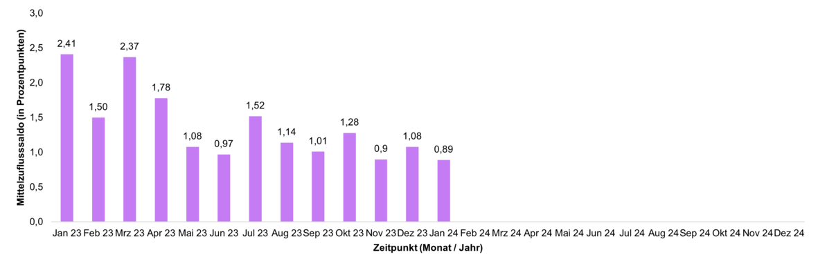 Veränderungen der Mittelzuflüsse und Mittelabflüsse werden über den Fundflow-Faktor ausgedrückt. Dabei werden die monatlichen Mittelzuflüsse des Berichtszeitraums in Relation zu den monatlichen Mittelabflüssen gesetzt. Bei einem Fundflow-Faktor über eins überwiegen die Mittelzuflüsse, bei einem Fundflow-Faktor unter eins die Mittelabflüsse.