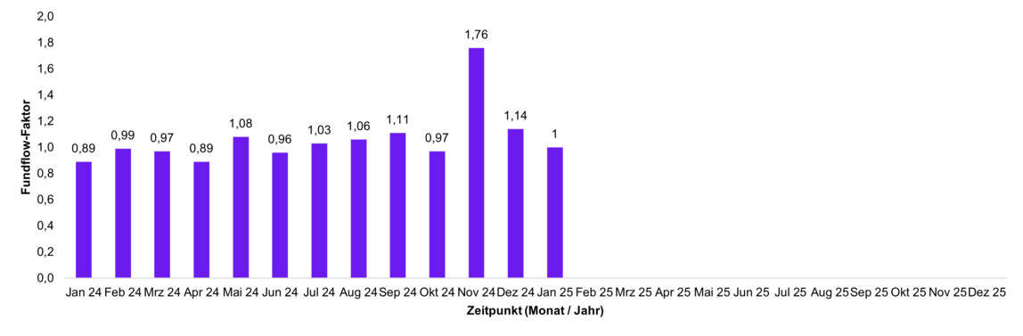 Veränderungen der Mittelzuflüsse und Mittelabflüsse werden über den Fundflow-Faktor ausgedrückt. Dabei werden die monatlichen Mittelzuflüsse des Berichtszeitraums in Relation zu den monatlichen Mittelabflüssen gesetzt. Bei einem Fundflow-Faktor über eins überwiegen die Mittelzuflüsse, bei einem Fundflow-Faktor unter eins die Mittelabflüsse.
