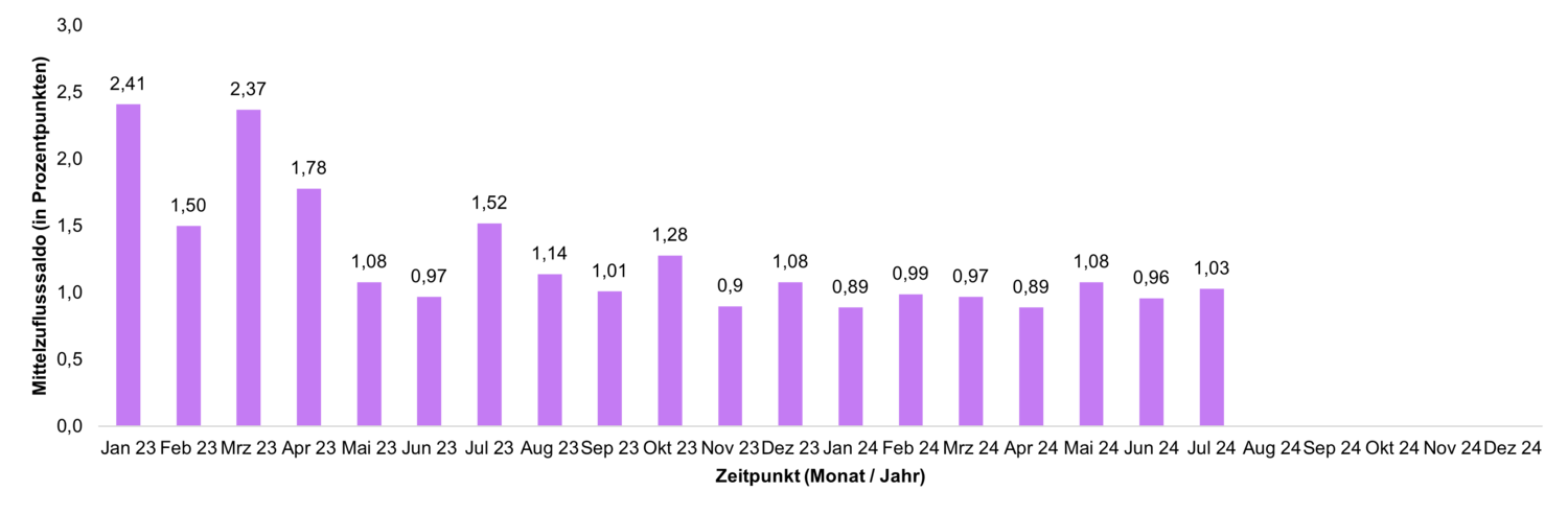 Veränderungen der Mittelzuflüsse und Mittelabflüsse werden über den Fundflow-Faktor ausgedrückt. Dabei werden die monatlichen Mittelzuflüsse des Berichtszeitraums in Relation zu den monatlichen Mittelabflüssen gesetzt. Bei einem Fundflow-Faktor über eins überwiegen die Mittelzuflüsse, bei einem Fundflow-Faktor unter eins die Mittelabflüsse.