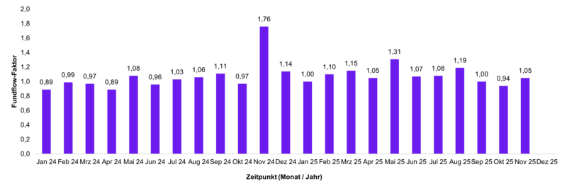 Veränderungen der Mittelzuflüsse und Mittelabflüsse werden über den Fundflow-Faktor ausgedrückt. Dabei werden die monatlichen Mittelzuflüsse des Berichtszeitraums in Relation zu den monatlichen Mittelabflüssen gesetzt. Bei einem Fundflow-Faktor über eins überwiegen die Mittelzuflüsse, bei einem Fundflow-Faktor unter eins die Mittelabflüsse.