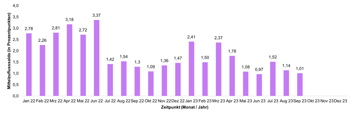 Veränderungen der Mittelzuflüsse und Mittelabflüsse werden über den Fundflow-Faktor ausgedrückt. Dabei werden die monatlichen Mittelzuflüsse des Berichtszeitraums in Relation zu den monatlichen Mittelabflüssen gesetzt. Bei einem Fundflow-Faktor über eins überwiegen die Mittelzuflüsse, bei einem Fundflow-Faktor unter eins die Mittelabflüsse.