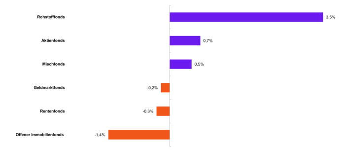 Auch im Dezember zeigten verschiedene Fondsarten unterschiedliche Entwicklungen. Besonders stark entwickelten sich Rohstofffonds, die mit einem Plus von 3,5% klar an der Spitze lagen. Auch Aktienfonds konnten zulegen und verzeichneten einen Anstieg auf 0,7%, während Mischfonds mit 0,5% ebenfalls im positiven Bereich blieben. Geldmarktfonds gaben leicht um 0,2% nach und Rentenfonds verloren 0,3%. Deutlich schwächer entwickelte sich offene Immobilienfonds, die mit einem Rückgang auf -1,4% das Schlusslicht bildeten.