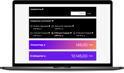 Sie möchten schnell und einfach erfahren, mit welchem Zinsertrag Sie rechnen können? Geben Sie dazu einfach in dem variablen Online-Rechner den Anlagebetrag, die Anlagedauer und den Zinssatz an.